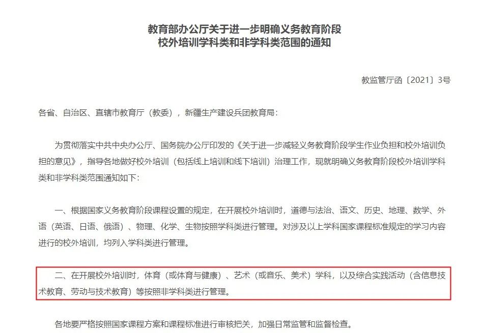 关于这一点,教育部7月29日下发的《教育部办公厅关于进一步明确义务教育阶段校外培训学科类和非学科类范围的通知》做出了解答。